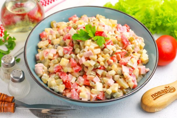 Описание приготовления: Можно миксовать любые продукты, сочетающиеся между собой по вкусу, вместо колбасы использовать отварную курицу или мясо: свинину, говядину, кролика. При заправке майонезом срок годности салата — 1 сутки, при заправке сметаной — 4-6 часов. Имейте это ввиду, если