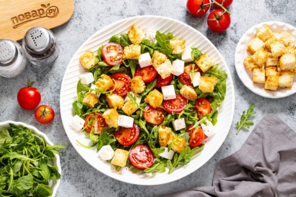 Описание приготовления: Ниже я расскажу подробнее, как приготовить салат из сухариков. Для сухариков лучше всего подойдет белый хлеб типа багета, чиабатты или батона. Вместо руколы можно использовать свежий шпинат, кейл или салат ромэн, а фету заменить на козий или адыгейский