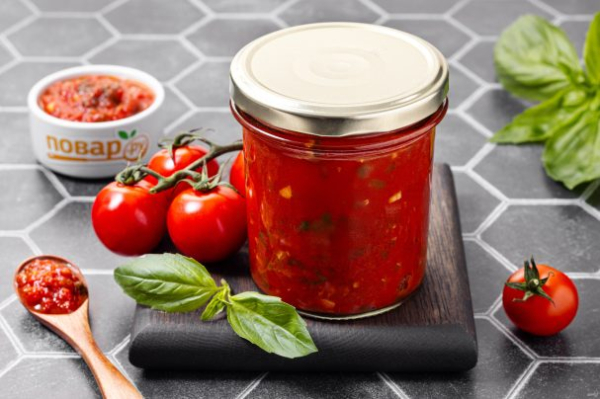 Описание приготовления: Расчет ингредиентов указан на емкость объемом 1 литр. Если у вас есть в наличии мясорубка или блендер, то приготовить такую консервацию в домашних условиях проще простого. Помидоры сначала пропариваются кипятком, а затем заливаются кипящим пюре, но не забудьте
